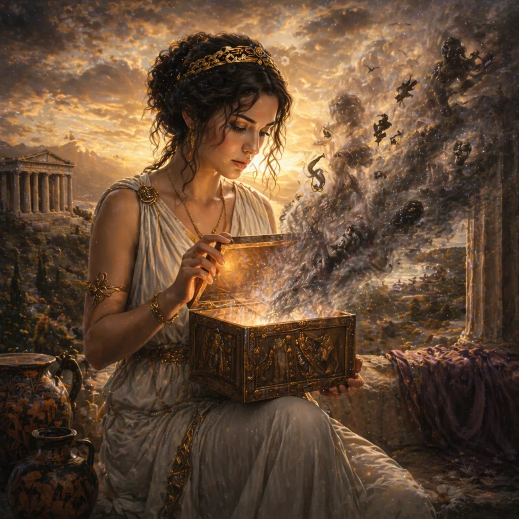 Pandora es el arquetipo del acto que no puede deshacerse. No representa el mal en sí, sino la apertura del sistema a lo desconocido, con todas sus consecuencias. Creada como un “regalo” cargado de ambivalencia, Pandora porta el recipiente que contiene fuerzas latentes. Su gesto —abrir— no es ignorancia simple, sino impulso de conciencia hacia lo prohibido o velado. Es el momento en que algo que estaba sellado pasa a existir en el mundo. En su luz, Pandora es expansión, revelación, acceso a lo real (aunque duela). En sombra, es imprudencia, falta de contención, activación de procesos que no se pueden controlar. Y sin embargo, siempre queda algo: la esperanza (Elpis) como residuo último.