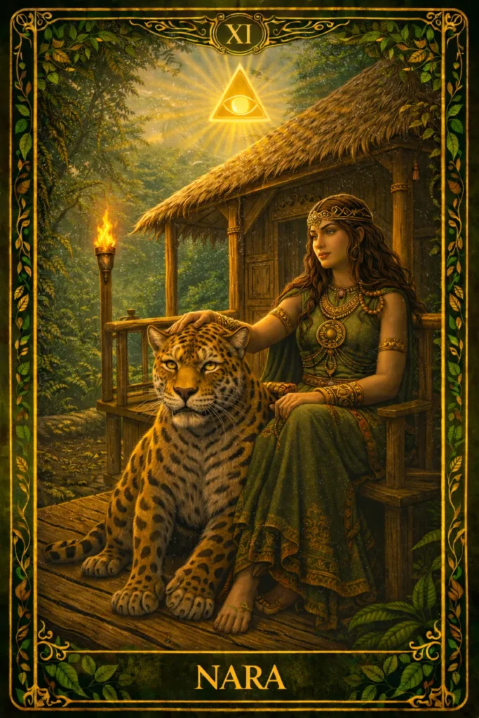 La Fuerza o Nara en el tarot Logia Amazonas, es el recordatorio de que no hace falta rugir para tener poder. Esta carta me conecta con mi centro cada vez que siento que todo me supera. Me recuerda que el verdadero liderazgo empieza por dentro. No se trata de reprimir la emoción, sino de abrazarla hasta que deje de asustar. Porque la Fuerza en el tarot no es control frío, sino contención amorosa.